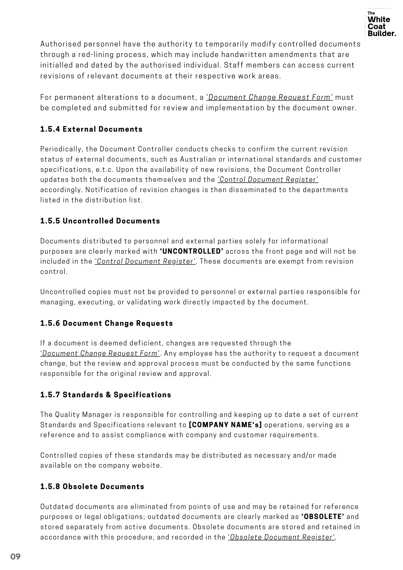 The Document Control procedure template is designed to help you manage all relevant data and organisational knowledge critical to your Quality Management System. This QSP ensures that your information is controlled, reviewed, and approved by authorised personnel before issuance, streamlining your processes and maintaining high standards of quality.